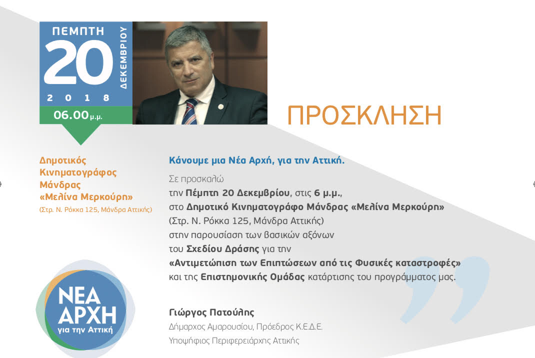 Ο Γιώργος Πατούλης , Δήμαρχος Αμαρουσίου, Πρόεδρος Κ.Ε.Δ.Ε. και Υποψήφιος Περιφερειάρχης Αττικής , θα παρουσιάσει σε ειδική εκδήλωση στη Μάνδρα Αττικής, την Πέμπτη 20 Δεκεμβρίου, τους άξονες του σχεδίου του για την αντιμετώπιση των φυσικών καταστροφών και την Πολιτική Προστασία.