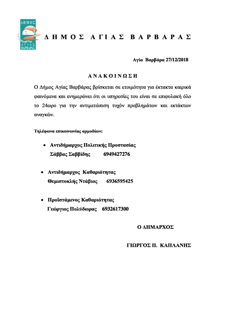 ΑΝΑΚΟΙΝΩΣΗ ΓΙΑ ΕΚΤΑΚΤΑ ΚΑΙΡΙΚΑ ΦΑΙΝΟΜΕΝΑ