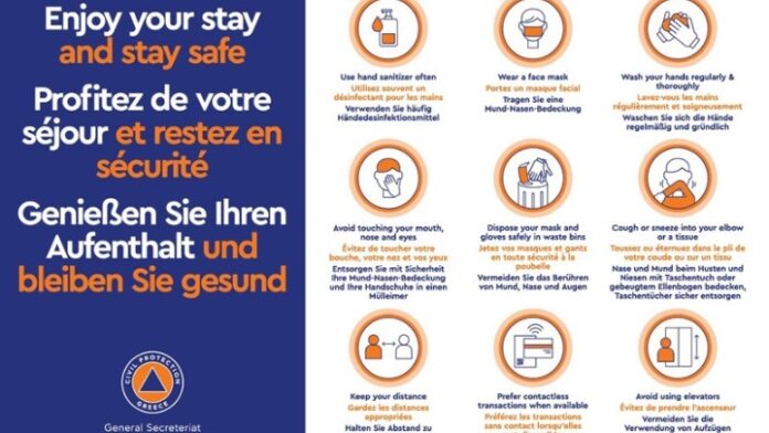 Με κεντρικό μήνυμα “Απολαύστε τη διαμονή σας – Μείνετε ασφαλείς «Enjoy your stay and stay safe», η Γενική Γραμματεία Πολιτικής Προστασίας (ΓΓΠΠ) προχώρησε στην έκδοση εννέα οδηγιών για τη λήψη των απαραίτητων μέτρων προστασίας από τον κορονοϊό, με δεδομένο ότι από την 1η Ιουλίου “ανοίγουν” 41 πύλες εισόδου στην Ελλάδα και ειδικότερα 27 αεροδρόμια, 7 χερσαία σημεία εισόδου και 7 λιμάνια.