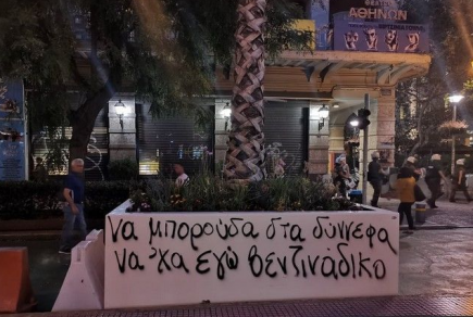 Με γκράφιτι και στίχους γέμισαν οι ζαρντινιέρες του Μεγάλου Περιπάτου σε Πανεπιστημίου και Σύνταγμα το απόγευμα της Τρίτης στη διάρκεια πορείας κατά του νομοσχεδίου για τις διαδηλώσεις.