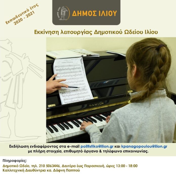 Ο Δήμος Ιλίου ενημερώνει για την εκκίνηση λειτουργίας του Δημοτικού Ωδείου και τα προγράμματα σπουδών της εκπαιδευτικής περιόδου 2020 – 2021, τα οποία θα περιλαμβάνουν την εκμάθηση των παρακάτω μουσικών οργάνων και μαθημάτων: