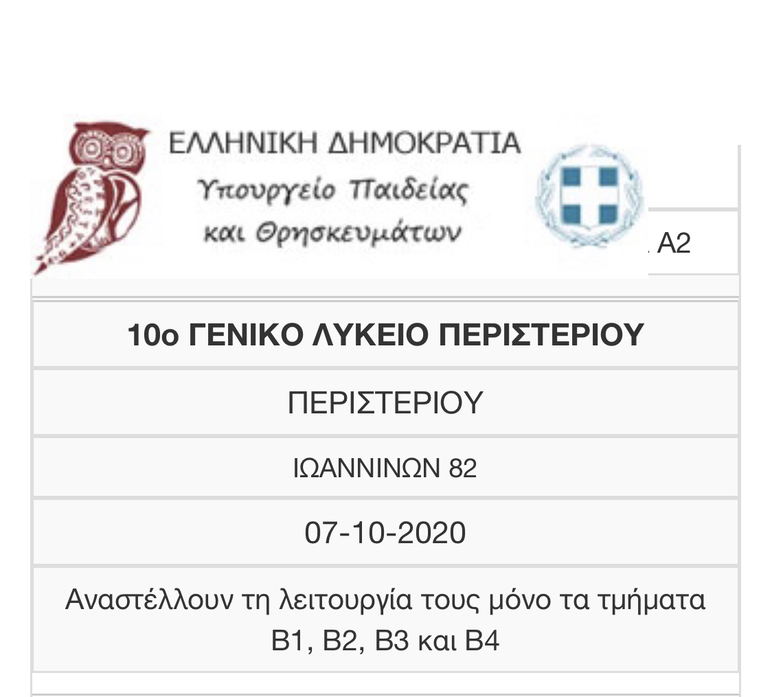 Διπλό κρούσμα εντοπίστηκε και στη Β’ τάξη στο 10ο Γενικό Λύκειο Περιστερίου με αποτέλεσμα να προστεθεί στη λίστα με τα κλειστά σχολεία. Το σχολείο που τελεί υπό κατάληψη ακόμα και αν ανοίξει τα τμήματα Β1, Β2, Β3, Β4 θα παραμείνουν κλειστά έως 7 Οκτωβρίου με εντολή του υπουργείου.