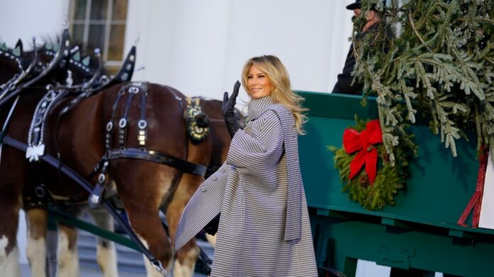 Τη Δευτέρα η Μελάνια βγήκε στη Βόρεια Πύλη του Λευκού Οίκου για να  υποδεχθεί το χριστουγεννιάτικο δέντρο, ένα «Fraser Fir» ύψους περίπου 5,5 μέτρων από τους Dan και Bryan Trees στη Δυτική Βιρτζίνια.