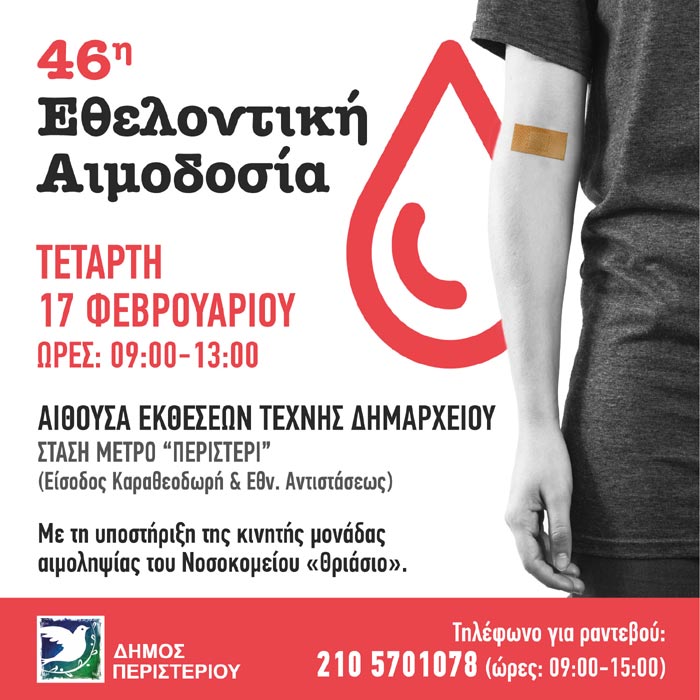 Ο Δήμος Περιστερίου διοργανώνει την 46η Εθελοντική Αιμοδοσία