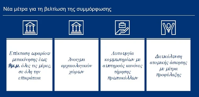 Στα νέα μέτρα που ανακοινώθηκαν συμπεριλαμβάνεται το άνοιγμα των κομμωτηρίων, των κέντρων αισθητικής αλλά και των αρχαιολογικών χώρων και των πάρκων (μετάβαση μόνο με τα πόδια ή με ποδήλατο) με όλα τα απαραίτητα μέτρα προστασίας από τη Δευτέρα 22 Μαρτίου.