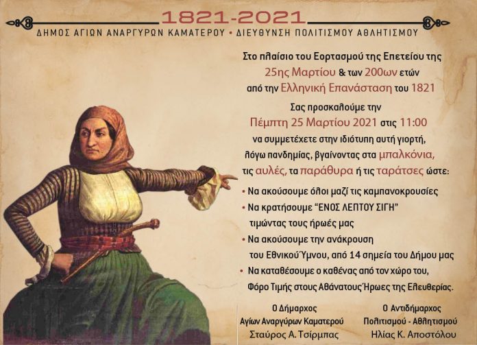 Ο Δήμος Αγίων Αναργύρων-Καματερού προσκαλεί τους δημότες να γιορτάσουν την Εθνική Επέτειο βγαίνοντας στα μπαλκόνια, στις αυλές και στις ταράτσες τιμώντας τους ήρωες πρόγονούς μας.