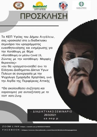 Το ΚΕΠ Υγείας του Δήμου Αιγάλεω, σας προσκαλεί την Παρασκευή 26.03.2021 και ώρα 12:30, στο 2o διαδικτυακό σεμινάριο του προγράμματος ευαισθητοποίησης και ενημέρωσης για την Κατάθλιψη, με θέμα «Κατάθλιψη εν μέσω Covid 19, Ζώντας με την κατάθλιψη – Μορφές θεραπείας» που θα πραγματοποιηθεί από το Ελληνικό Διαδημοτικό Δίκτυο Υγιών Πόλεων σε συνεργασία με την Ψυχολόγο Σμαράγδα Χρηστάκη, υπο την Αιγίδα της Περιφέρειας Αττικής