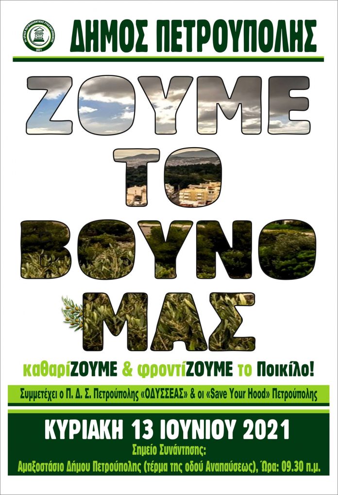 Με το σύνθημα «Ζούμε το Βουνό μας! ΚαθαρίΖΟΥΜΕ & ΦροντίΖΟΥΜΕ το Ποικίλο!» την Κυριακή 13 Ιουνίου 2021 και ώρα 9:30 π.μ. ο Δήμαρχος Πετρούπολης Στέφανος Γαβριήλ Βλάχος και η Διοίκηση του Δήμου, στέλνουν ανοιχτή πρόσκληση σε πολίτες, ομάδες, συλλόγους, φορείς, μαθητές και εθελοντές, καλώντας τους να γίνουν όλοι μαζί μια αγκαλιά προστασίας και φροντίδας του Ποικίλου Όρους, σε μια δράση περιβαλλοντικής ευαισθητοποίησης.