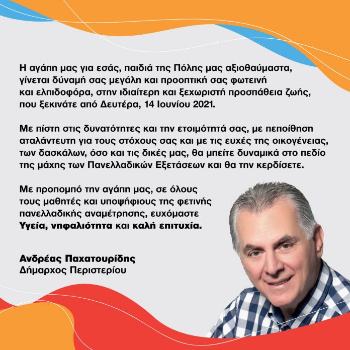 Η αγάπη μας για εσάς, παιδιά της Πόλης μας αξιοθαύμαστα, γίνεται δύναμή σας μεγάλη και προοπτική σας φωτεινή και ελπιδοφόρα, στην ιδιαίτερη και ξεχωριστή προσπάθεια ζωής, που ξεκινάτε από Δευτέρα, 14 Ιουνίου 2021.