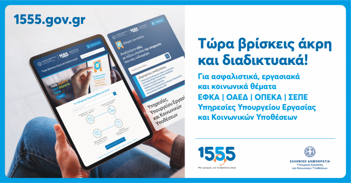Σε λειτουργία τέθηκε η ιστοσελίδα του 1555 – 1555.gov.gr, του Ενιαίου Αριθμού Εξυπηρέτησης Πολιτών για εργασιακά, ασφαλιστικά και κοινωνικά θέματα του Υπουργείου Εργασίας και Κοινωνικών Υποθέσεων και των εποπτευόμενων φορέων ΕΦΚΑ, ΟΑΕΔ και ΟΠΕΚΑ.