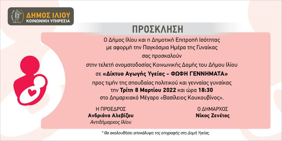 Tελετή ονοματοδοσίας Κοινωνικής Δομής σε “Δίκτυο Αγωγής Υγείας – Φώφη Γεννηματά” θα γίνει σήμερα Τρίτη 8 Μαρτίου 2022 και ώρα 18:30 με αφορμή την Παγκόσμια Ημέρα της Γυναίκας στο Δημαρχιακό Μέγαρο “Βασίλειος Κουκουβίνος”.