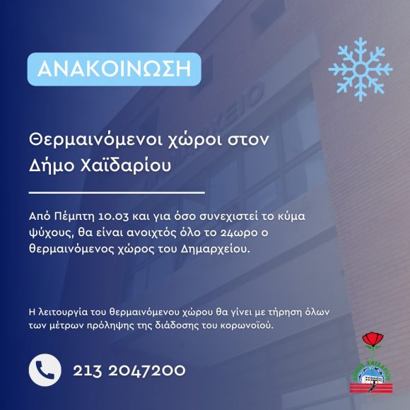 Από Πέμπτη 10.03 και για όσο συνεχιστεί το κύμα ψύχους, θα είναι ανοιχτός όλο το 24ωρο ο θερμαινόμενος χώρος του Δημαρχείου Χαϊδαρίου (Λεωφόρος Αθηνών και Στρ. Καραϊσκάκη).