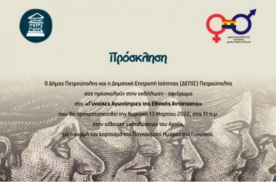 Ο Δήμος Πετρούπολης και η Δημοτική Επιτροπή Ισότητας (ΔΕΠΙΣ) Πετρούπολης, με αφορμή τον εορτασμό της Παγκόσμιας Ημέρας της Γυναίκας, διοργανώνουν εκδήλωση – αφιέρωμα στις «Γυναίκες Αγωνίστριες της Εθνικής Αντίστασης», την Κυριακή 13 Μαρτίου 2022, στις 11 π.μ. στην αίθουσα εκδηλώσεων του Apolis.