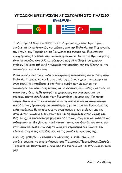 Ο Δήμαρχος Περιστερίου Ανδρέας Παχατουρίδης υποδέχθηκε στο Δημαρχιακό Μέγαρο Περιστερίου μαθητές και εκπαιδευτικούς από τις χώρες (Πολωνία, Πορτογαλία, Ιταλία, Τουρκία και Βουλγαρία), στο πλαίσιο του προγράμματος «Erasmus+» που συμμετέχει ενεργά το 32ο Δημοτικό Σχολείο. Καλωσορίζοντας τη διεθνή εκπαιδευτική συνάντηση στην πόλη μας, τόνισεότι είναι μια ευκαιρία μέσα από το πρόγραμμα να υλοποιήσουν εκπαιδευτικές δράσεις, να γνωρίσουν τις κουλτούρες των λαών τους, καθώς και να ανταλλάξουν καλές πρακτικές και καινοτόμες ιδέες.