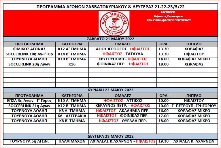 Πρόγραμμα αγώνων για τον Ήφαιστο Περιστερίου 21-23/5