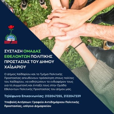 Ο Δήμος Χαϊδαρίου και το Τμήμα Πολιτικής Προστασίας απευθύνουν πρόσκληση στους πολίτες του Χαϊδαρίου, να εκδηλώσουν το ενδιαφέρον τους για τη συμμετοχή και ένταξη τους στην Ομάδα Εθελοντών Πολιτικής Προστασίας του Δήμου μας.