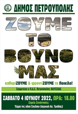 Με το σύνθημα «Ζούμε το Βουνό μας! ΚαθαρίΖΟΥΜΕ & ΦροντίΖΟΥΜΕ το Ποικίλο!», ο Δήμαρχος Πετρούπολης Στέφανος Γαβριήλ Βλάχος και η Διοίκηση του Δήμου, στέλνουν ανοιχτή πρόσκληση σε πολίτες, ομάδες, συλλόγους, φορείς, μαθητές και εθελοντές, καλώντας τους να γίνουν όλοι μαζί μια αγκαλιά προστασίας και φροντίδας του Ποικίλου Όρους, σε μια δράση περιβαλλοντικής ευαισθητοποίησης.