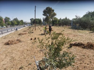 Οι υπηρεσίες πρασίνου του Δήμου μας επιμελήθηκαν τη φύτευση και αναλαμβάνουν τη συντήρηση του έργου, που αποτελεί τη συνέχεια του αρχαίου παραδοσιακού ελαιώνα της περιοχής.
