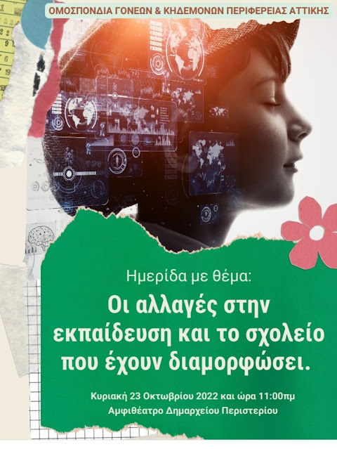 Ημερίδα της Ομοσπονδίας Γονέων Περιφέρειας Αττικής για τις αλλαγές στην εκπαίδευση και το σχολείο που έχουν διαμορφώσει την Κυριακή 23 Οκτωβρίου στις 11:00 π.μ.στο Αμφιθέατρο του Δημαρχείου Περιστερίου