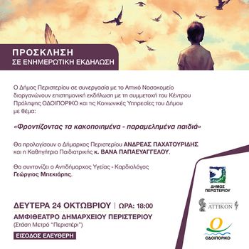 Ενημερωτική εκδήλωση «Φροντίζοντας τα κακοποιημένα – παραμελημένα παιδιά» θα πραγματοποιηθεί τη Δευτέρα 24 Οκτωβρίου 2022, ώρα 18.00 στο Αμφιθέατρο του Δημαρχιακού Μεγάρου Περιστερίου (πλατεία Δημαρχείου – στάση Μετρό «Περιστέρι»). Είσοδος Ελεύθερη.