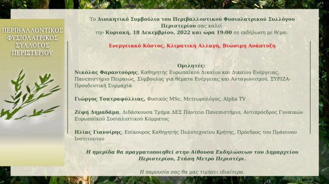 Το Διοικητικό Συμβούλιο του Περιβαλλοντικού & Φυσιολατρικού Συλλόγου Περιστερίου, προσκαλεί τα μέλη και τους φίλους του την Κυριακή 18 Δεκεμβρίου 2022 στις 7.00 μμ στην αίθουσα εκδηλώσεων του Δημαρχείου Περιστερίου σε εκδήλωση με θέμα: