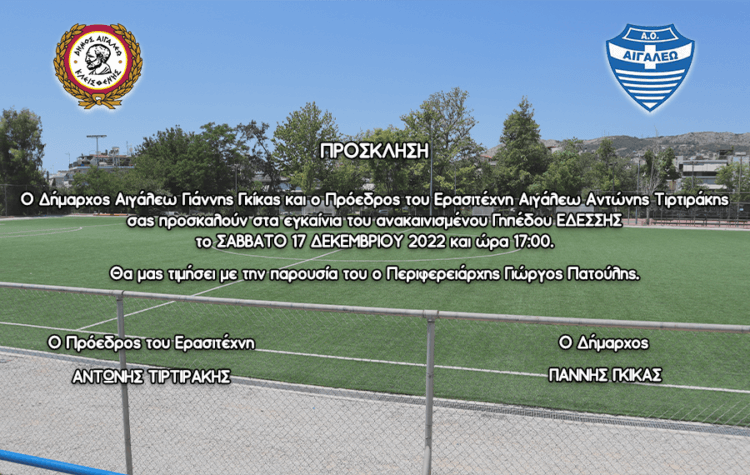 Ο Δήμαρχος Αιγάλεω Γιάννης Γκίκας και ο Πρόεδρος του Ερασιτέχνη Αιγάλεω Αντώνης Τιρτιράκης, σας προσκαλούν στα εγκαίνια του ανακαινισμένου Γηπέδου ΕΔΕΣΣΗΣ, το ΣΑΒΒΑΤΟ 17 ΔΕΚΕΜΒΡΙΟΥ 2022 και ώρα 17:00.