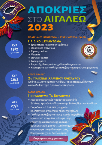 Οι αποκριάτικες εκδηλώσεις και τα κούλουμα στον Δήμο Αιγάλεω υπόσχονται μοναδικές στιγμές για όλους τους συμπολίτες μας. Την Κυριακή 19 Φεβρουαρίου τα παιδιά θα ξεφαντώσουν με εργαστήρια κατασκευής μάσκας, φουσκωτά παιχνίδια, ήρωες cartoon, μασκότ, survivor games, σόου με μάγο, ανιματέρ, θεατρικό παιχνίδι, διαγωνισμοί και κεράσματα. Μια εβδομάδα αργότερα στις 26 του μήνα ο Σύλλογος Κρητών Αιγάλεω «Η Κρητική Αναγέννηση» και το 2ο Σύστημα Προσκόπων Αιγάλεω μας περιμένουν στο Άλσος για ένα συναρπαστικό παιχνίδι χαμένου θησαυρού.