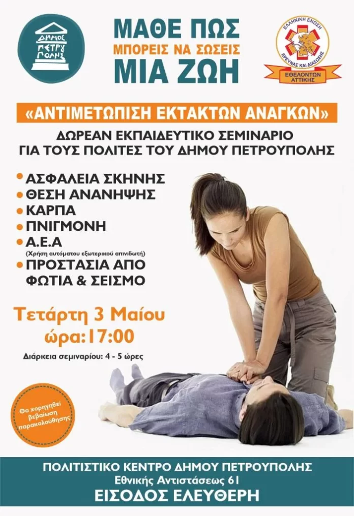 Το Σεμινάριο «Αντιμετώπισης Εκτάκτων Αναγκών» θα πραγματοποιηθεί την Τετάρτη 3 Μαΐου 2023, κατά τις ώρες 17:00 – 21:00, στο Πολιτιστικό Κέντρο του Δήμου Πετρούπολης (Εθνικής Αντιστάσεως 61).