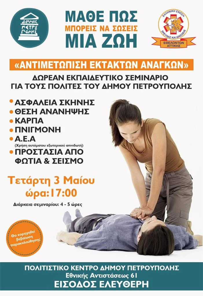 Με δεδομένη τη χρησιμότητα γνώσης Α’ Βοηθειών αλλά και της πρόληψης, ο Δήμος Πετρούπολης σε συνεργασία με την Ελληνική Ένωση Έρευνας & Διάσωσης Εθελοντών Αττικής (Ε.Ε.Ε.Δ.Ε.Α.), διοργανώνει ένα εξαιρετικά χρήσιμο Εκπαιδευτικό Σεμινάριο διάρκειας τεσσάρων με πέντε (4-5) ωρών, με θέμα την «Αντιμετώπιση Εκτάκτων Αναγκών», για όλους ανεξαιρέτως τους πολίτες του Δήμου μας και όχι μόνο.