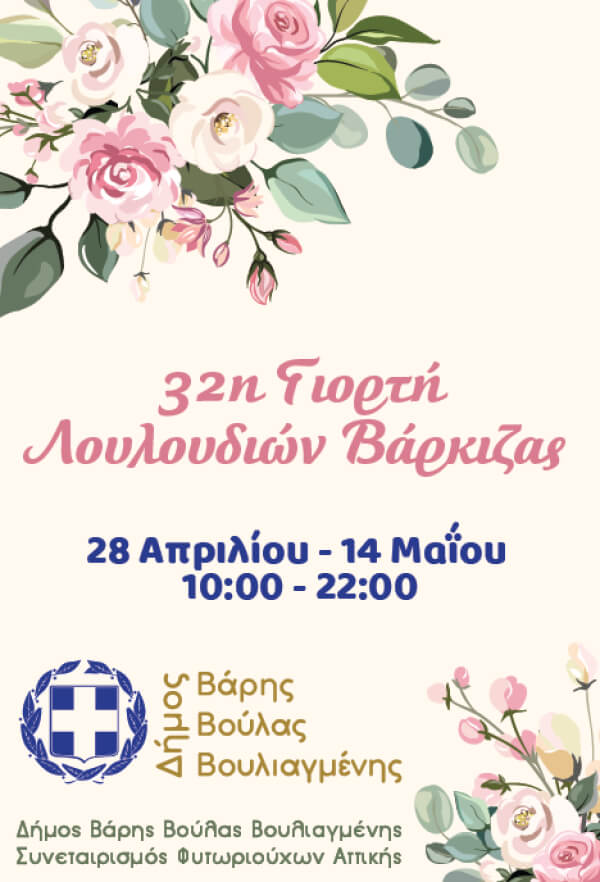 Την 32η Ανθοκομική Έκθεση διοργανώνει o Δήμος Βάρης Βούλας Βουλιαγμένης σε συνεργασία με τον Ανθοκομικό Συνεταιρισμό Φυτωριούχων Αττικής, η οποία θα λειτουργεί καθημερινά από τις 28 Απριλίου έως και τις 14 Μαΐου, στο πλακόστρωτο της παραλίας Βάρκιζας, από τις 10:00 έως 22:00.