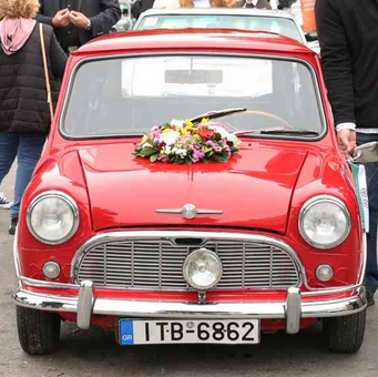 Τα ιστορικά αυτοκίνητα που με μεράκι και κόπο διατηρούνται σε άριστη κατάσταση από τους ιδιοκτήτες τους, ήταν στολισμένα με μαγιάτικα στεφάνια της Ανθοκομικής Έκθεσης Κηφισιάς.