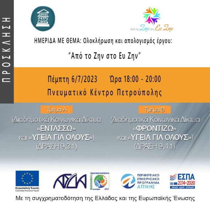 Η Ημερίδα με θέμα: Ολοκλήρωση και απολογισμός του έργου «Από το Ζην στο Ευ Ζην» θα πραγματοποιηθεί την Πέμπτη 6 Ιουλίου 2023, κατά τις ώρες 18:00 – 20:00, στο Πνευματικό Κέντρο του Δήμου Πετρούπολης, (Μπουμπουλίνας 59 & Αθανασίου Διάκου).