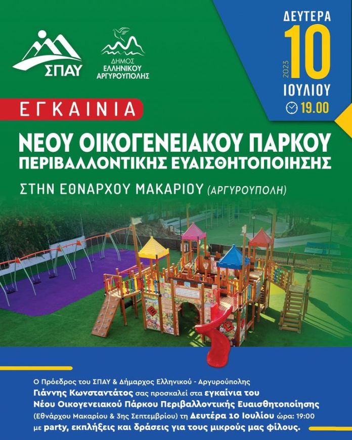 Εγκαίνια του Οικογενειακού Πάρκου Περιβαλλοντικής Ευαισθητοποίησης που δημιούργησε ο ΣΠΑΥ σε συνεργασία με τον Δήμο Ελληνικού – Αργυρούπολης μέσω του Προγράμματος “Αντώνης Τριτσης”, θα πραγματοποιηθούν την Δευτέρα 10 Ιουλίου στις 19:00 στην οδό Εθνάρχου Μακαρίου & 3ης Σεπτεμβρίου στην Αργυρούπολη.