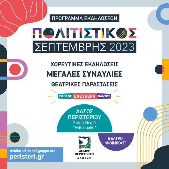 Ο Δήμος Περιστερίου διοργανώνει και φέτος τις θεσμοθετημένες εκδηλώσεις «Πολιτιστικός Σεπτέμβρης 2023» στο ομορφότερο Άλσος της Αττικής, στο Άλσος Περιστερίου – Στάση Μετρό “Ανθούπολη”. Ώρα έναρξης 20:00, με είσοδο ελεύθερη!