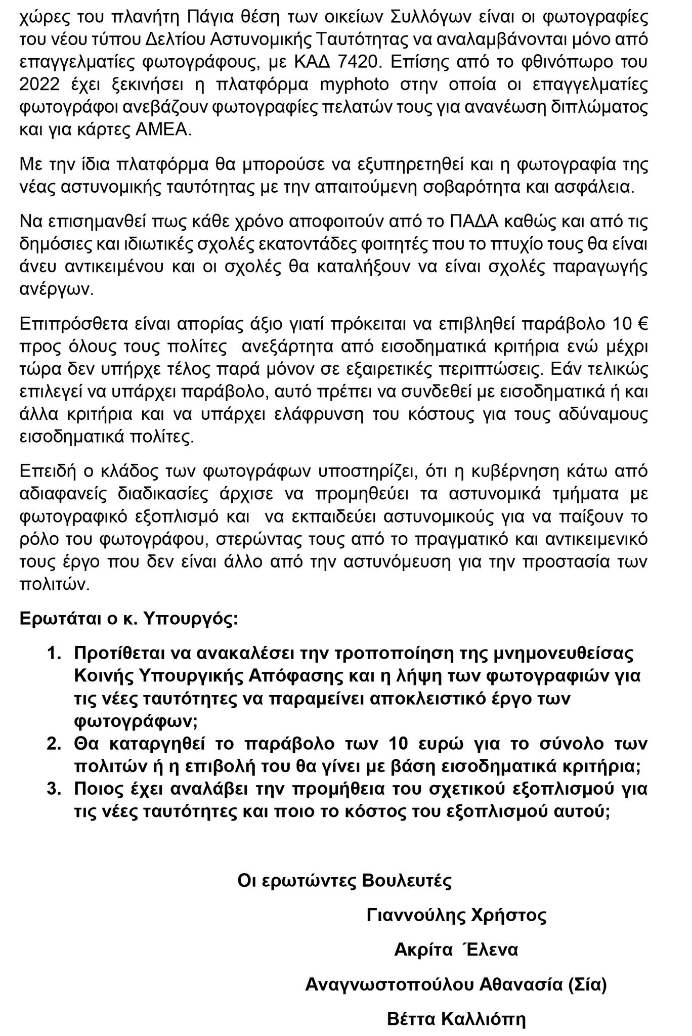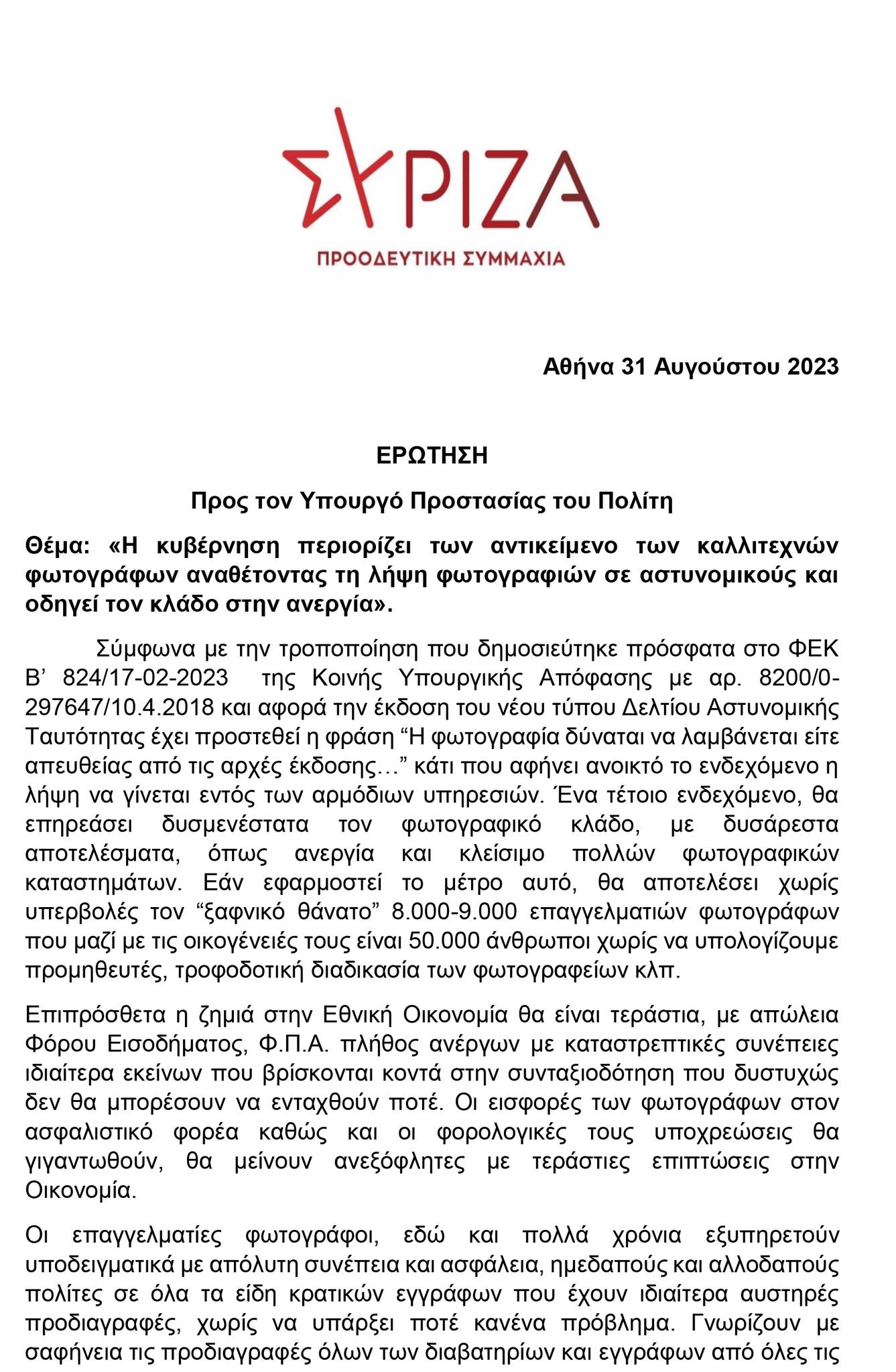 Όπως ήδη σας έχουμε προαναφέρει η Ε.Κ.Φ.Α. έχει ενημερώσει εγγράφως, εδώ και καιρό, τις κοινοβουλευτικές ομάδες, αλλά και τους προέδρους των κοινοβουλευτικών ομάδων για την υφαρπαγή της Φωτογραφίας της Νέας Ταυτότητας από το κράτος με μια σκανδαλώδη απευθείας ανάθεση και ζητήσαμε να γίνουν παρεμβάσεις στη βουλή με την μορφή επερωτήσεων, στοχεύοντας βέβαια στο πρόβλημα που μας απασχολεί. Με αργά αντανακλαστικά είναι αλήθεια, και λόγω των εκλογών που προηγήθηκαν, αλλά και της Αυγουστιάτικης ραστώνης και κρατικής απραξίας, ανταποκρίθηκαν μέχρι στιγμής το ΠΑΣΟΚ ΚΙΝΑΛ και ο ΣΥΡΙΖΑ ΠΣ. Ο ΣΥΡΙΖΑ ΠΣ κατέθεσε σήμερα την επερώτηση και όχι χθες όπως αρχικά σας πληροφορήσαμε. Την επερώτηση κατέθεσε ο κύριος Χρήστος Γιαννούλης. Τα υπόλοιπα κόμματα μέχρι στιγμής κωφεύουν παρά τις επανειλημμένες εκκλήσεις μας. Θα δημοσιεύσουμε, όπως έχουμε άλλωστε υποχρέωση αν υπάρξουν άλλες επερωτήσεις και από άλλους πολιτικούς χώρους.