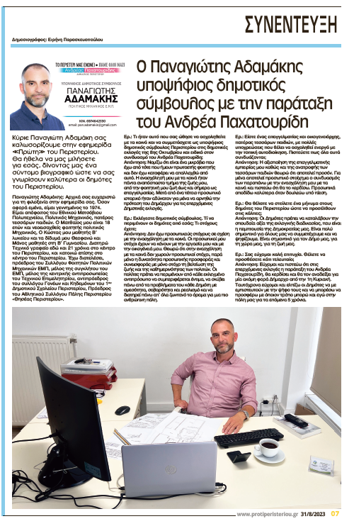 Παναγιώτης Αδαμάκης: Αρχικά σας ευχαριστώ για τη φιλοξενία στην εφημερίδα σας. Όσον αφορά εμένα, είμαι γεννημένος το 1974. Είμαι απόφοιτος του Εθνικού Μετσόβιου Πολυτεχνείου, Πολιτικός Μηχανικός, πατέρας τεσσάρων παιδιών. Ο Ματθαίος μου είναι 18 ετών και νεοεισαχθείς φοιτητής πολιτικός Μηχανικός, Ο Κώστας μου μαθητής Β΄ λυκείου και τα δίδυμά μου Θεοφανώ και Μάνος μαθητές στη Β΄ Γυμνασίου. Διατηρώ Τεχνικό γραφείο εδώ και 21 χρόνια στο κέντρο του Περιστερίου, και κατοικώ επίσης στο κέντρο του Περιστερίου. Έχω διατελέσει, πρόεδρος του Συλλόγου Φοιτητών Πολιτικών Μηχανικών ΕΜΠ, μέλος της συγκλήτου του ΕΜΠ, μέλος της κεντρικής αντιπροσωπείας του Τεχνικού Επιμελητηρίου, αντιπρόεδρος του συλλόγου Γονέων και Κηδεμόνων του 1ου Δημοτικού Σχολείου Περιστερίου, Πρόεδρος του Αθλητικού Συλλόγου Πάλης Περιστερίου «Θησέας Περιστερίου».