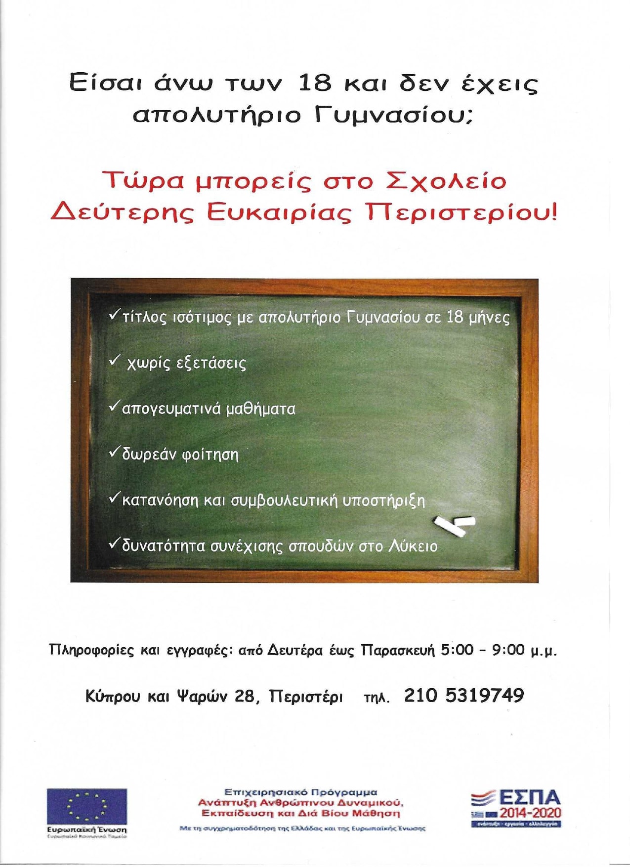 Κύπρου και Ψαρών 28, Περιστέρι (300 μέτρα από σταθμό μετρό «Άγιος Αντώνιος»)     Τηλέφωνο επικοινωνίας: 210 5319749                   https://blogs.sch.gr/sdeper/