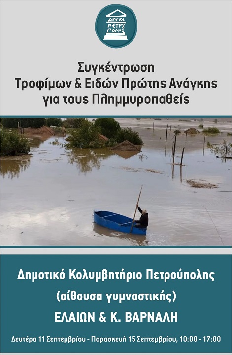 Ο Δήμος Πετρούπολης πραγματοποιεί Δράση αλληλεγγύης & συγκέντρωσης τροφίμων και ειδών πρώτης ανάγκης για τους πλημμυροπαθείς και καλεί όσους πολίτες επιθυμούν να συνεισφέρουν σε αυτή την προσπάθεια, προκειμένου να στηρίξουμε και να βοηθήσουμε τους συνανθρώπους μας.