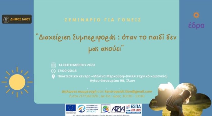 Το Ψυχοπαιδαγωγικό Κέντρο Παιδιού και Οικογένειας του Δήμου Ιλίου διοργανώνει σεμινάριο για γονείς με θέμα «Διαχείριση Συμπεριφοράς: όταν το παιδί δεν μας ακούει», την Πέμπτη 14 Σεπτεμβρίου 2023 και ώρα 17:00, στο Καλλιτεχνικό καφενείο «Θ. Αγγελόπουλος», στο Πολιτιστικό Κέντρο «Μελίνα Μερκούρη» (οδός Αγίου Φανουρίου 99, Ίλιον).