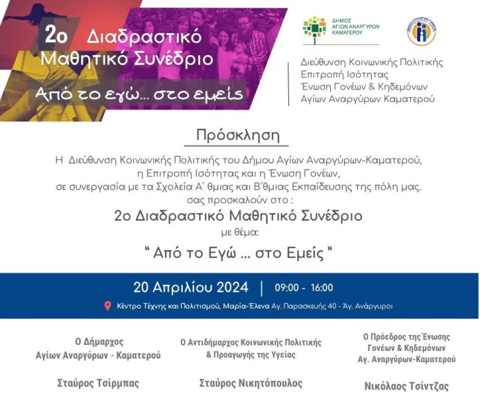 Ο Δήμος Αγίων Αναργύρων-Καματερού θα υλοποιήσει το 2ο Διαδραστικό Συνέδριο «Από το Εγώ στο Εμείς» το Σάββατο 20 Απριλίου 2024 στο Κέντρο Τέχνης και Πολιτισμού, Αγίας Παρασκευής 40, Αγιοι Ανάργυροι από τις 09.00-16.00.