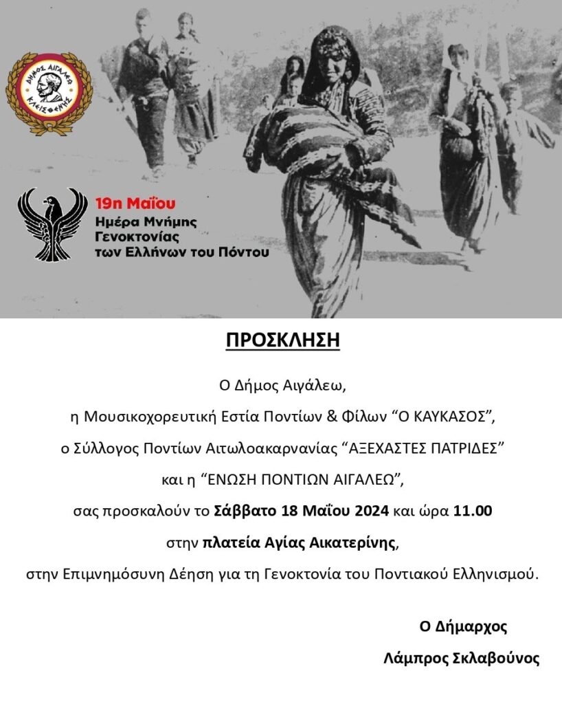 Ο Δήμος Αιγάλεω τιμά την Ημέρα Μνήμης της Γενοκτονίας του Ποντιακού Ελληνισμού και σε συνεργασία με τη Μουσικοχορευτική Εστία Ποντίων και Φίλων “Ο ΚΑΥΚΑΣΟΣ”, τον Σύλλογο Ποντίων Αιτωλοακαρνανίας “ΑΞΕΧΑΣΤΕΣ ΠΑΤΡΙΔΕΣ” και την “ΕΝΩΣΗ ΠΟΝΤΙΩΝ ΑΙΓΑΛΕΩ”, καλεί τους δημότες να παραστούν στην Επιμνημόσυνη Δέηση που θα πραγματοποιηθεί για τα 105 χρόνια από τη Γενοκτονία του Ποντιακού Ελληνισμού, το Σάββατο 18 Μαΐου 2024 και ώρα 11 π.μ. στην πλατεία Αγίας Αικατερίνης.