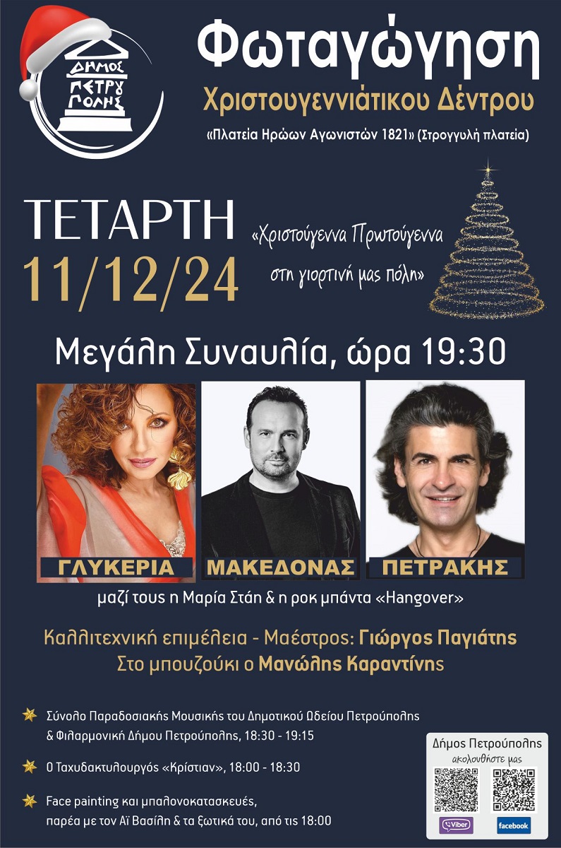 Ο Δήμος Πετρούπολης σας προσκαλεί, την Τετάρτη 11 Δεκεμβρίου από τις 18:00, στη στρογγυλή πλατεία της πόλης για να φωταγωγήσουμε μαζί το χριστουγεννιάτικο δέντρο και να διασκεδάσουμε με την ψυχή μας.
