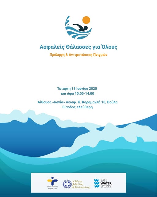 Στο πλαίσιο ενίσχυσης της ασφάλειας στη θάλασσα και μείωσης των τραυματισμών και των πνιγμών στη χώρα μας, ο Εθνικός Οργανισμός Δημόσιας Υγείας, σε συνεργασία με το Δήμο Βάρης Βούλας Βουλιαγμένης και η ΜΚΟ “Safe Water Sports” διοργανώνει ενημερωτική εκδήλωση με θέμα «Ασφαλείς Θάλασσες για Όλους: Πρόληψη & Αντιμετώπιση Πνιγμών».