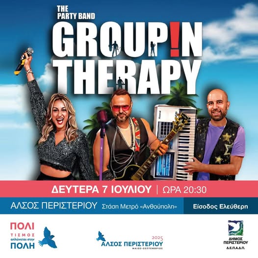 Σήμερα, Δευτέρα 7 Ιουλίου και ώρα 20:30 στο Άλσος Περιστερίου – Στάση Μετρό Ανθούπολη θα απολαύσουμε το συγκρότημα Group IN Therapy – The Party Band LIVE!