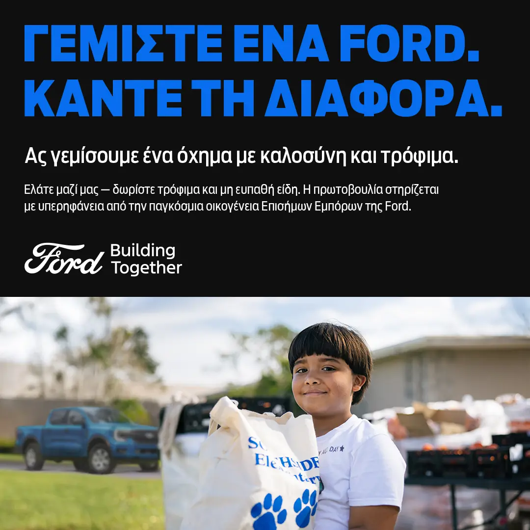 Η Ford Motor Company επεκτείνει το Ford Building Together – τη νέα κοινωνική πρωτοβουλία της εταιρείας – με στόχο να ενισχύσει τον θετικό αντίκτυπο σε παγκόσμιο επίπεδο και να στηρίξει τις τοπικές ανάγκες. Η πρωτοβουλία αποτυπώνει τη δύναμη της Ford, συνδυάζοντας την εταιρική φιλανθρωπία, τον εθελοντισμό των εργαζομένων και το παγκόσμιο δίκτυο εμπόρων, ώστε να ανταποκρίνεται σε ανάγκες που σχετίζονται με την ανάπτυξη της κοινότητας, την εκπαίδευση, την επισιτιστική ασφάλεια και την ανακούφιση των πληγέντων από καταστροφές.