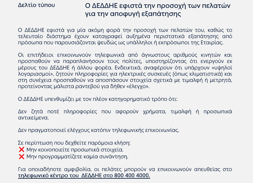 Αυξημένα τα περιστατικά εξαπάτησης από πρόσωπα που παρουσιάζονται ψευδώς ως υπάλληλοι του ΔΕΔΔΗΕ