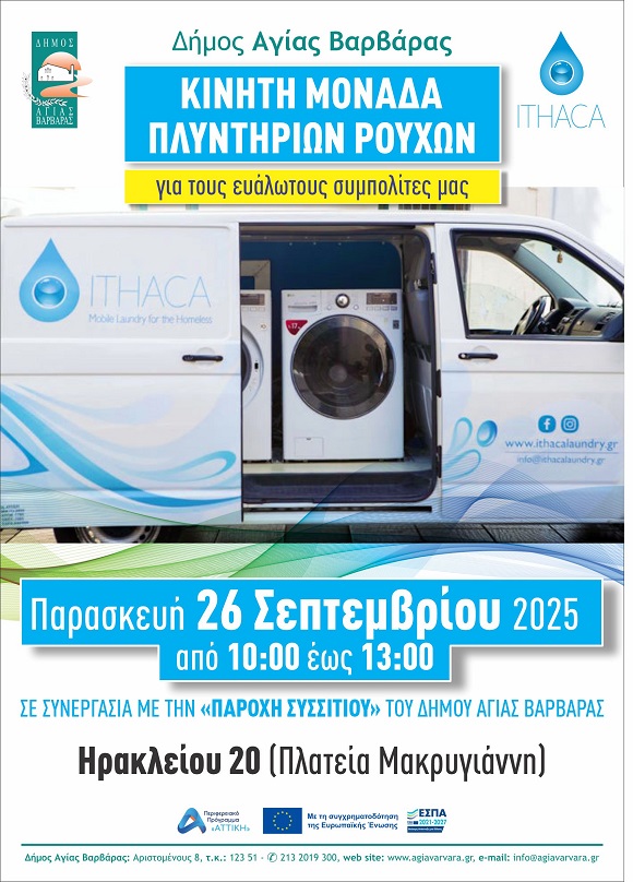 Η δομή Παροχής Συσσιτίου του δήμου Αγίας Βαρβάρας και η ΜΚΟ Ithaca ενώνουν τις δυνάμεις τους για την υποστήριξη των πιο ευάλωτων συμπολιτών μας, δίνοντάς τους τη δυνατότητα να περιποιηθούν την προσωπική τους υγιεινή και να πλύνουν τα ρούχα τους με άνεση και αξιοπρέπεια.