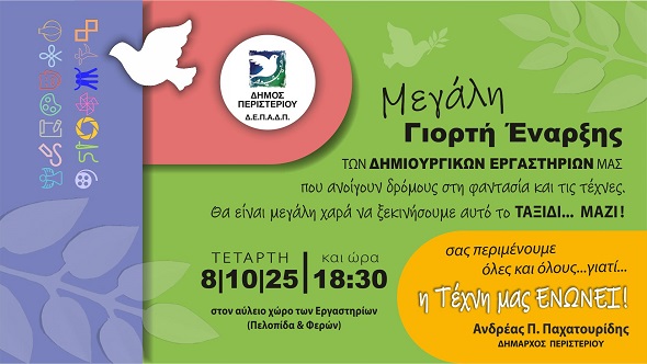 Ο Δήμαρχος Περιστερίου, Ανδρέας Π. Παχατουρίδης, σας προσκαλεί στη Μεγάλη Γιορτή Έναρξης των Δημιουργικών Εργαστηρίων του Δήμου Περιστερίου, την Τετάρτη 8 Οκτωβρίου 2025 και ώρα 18:30, στον αύλειο χώρο των Εργαστηρίων (Πελοπίδα & Φερών) στη Νέα Ζωή.