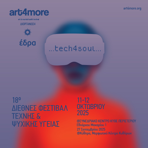 Tο ART4MORE 2025 “Tech4Soul”, με τη συμμετοχή καλλιτεχνών, ειδικών της ψυχικής υγείας και της τεχνολογίας, σας καλεί να ζήσετε μια μοναδική εμπειρία που αναδεικνύει τη δύναμη της τέχνης και της τεχνολογίας ως εργαλεία έκφρασης δημιουργικότητας και ψυχικής ευεξίας.