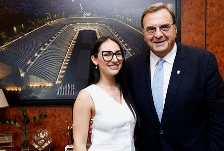 Ο κ. Κούβελος υποδέχθηκε την Κλαυδία στην Ελληνική Ολυμπιακή Επιτροπή και την ευχαρίστησε που αποδέχθηκε την πρόσκληση της ΕΟΕ. «Με χαρά παρουσιάζω σήμερα την αγαπημένη σε όλους τους Έλληνες και ειδικότερα στα νέα παιδιά, Κλαυδία, που τίμησε τη χώρα μας στον τελευταίο διαγωνισμό της Eurovision και βεβαίως θέλω να αναφερθώ στην μεγάλη Τελετή που κάνει η Ελληνική Ολυμπιακή Επιτροπή. Φέτος στις 26 Νοεμβρίου θα γίνει η Αφή της Φλόγας για τους Χειμερινούς Αγώνες Μιλάνο Κορτίνα που είναι τον Φεβρουάριο του 2026 και στις 4 Δεκεμβρίου θα παραδώσουμε τη Φλόγα στους διοργανωτές, τους Ιταλούς. Η Φλόγα δεν είναι απλώς μια φλόγα, είναι αυτό που περιέχει, οι αξίες, ο σεβασμός, η φιλία, η αριστεία, η ειρήνη, η αλληλεγγύη. Είναι όλα αυτά τα οποία μεταλαμπαδεύει η χώρα μας, περνάει από τα χέρια του κάθε λαμπαδηδρόμου για να φτάσει στην πόλη και στη χώρα που διοργανώνει τους Ολυμπιακούς Αγώνες και να εμπνεύσει τη νεολαία και τον κόσμο με τις Ολυμπιακές αξίες που γεννήθηκαν στη χώρα μας. Εκ μέρους της ΕΟΕ θέλω να την ευχαριστήσω από καρδιάς που δέχθηκε αμέσως να αποτελέσει ένα κομμάτι της Τελετής και να είναι κοντά μας. Εκτός του ότι είναι ένα σπουδαίο παιδί με αξίες, είναι ένας άνθρωπος που αγαπάει τον αθλητισμό και ήταν και η ίδια αθλήτρια.»